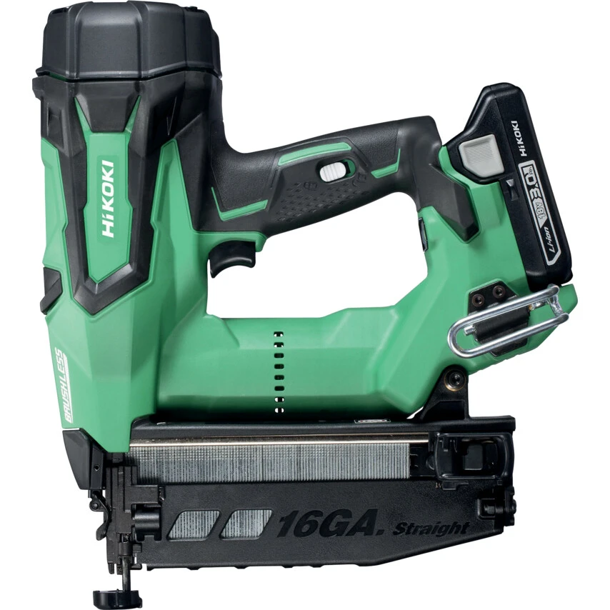 The Hikoki NT1850DM 18v Li-Ion Brushless 16Ga Straight Finish Nailer has a unique air spring drive system (similar to Hikoki’s pneumatic line) that uses compressed air to drive each nail resulting in zero ramp up time, increased shooting speed, recoil that feels like a pneumatic nailer, quicker response time between drives, better flush driving, even at an angle and easy maintenance due to fewer parts to manage.